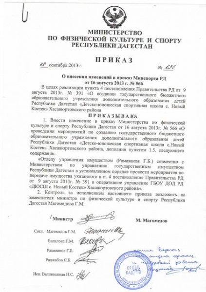 Приказ о внесении изменений в приказ Минспорта РД от 16 августа 2013 года. №566